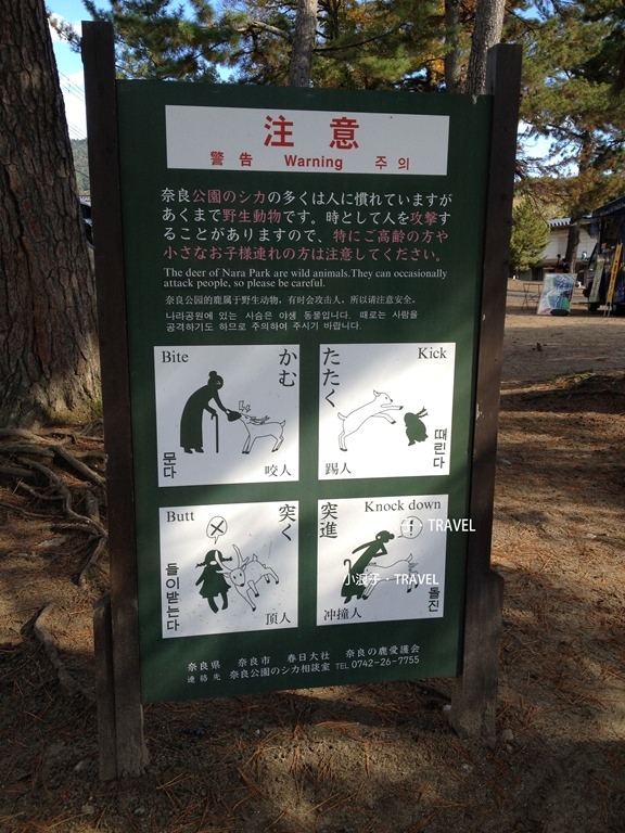 再往裡面走, 就開始進入奈良公園中央位置, 可以看到不少警告牌, 提示野鹿可能會......咬人, 踢人, 頂人或衝撞人。