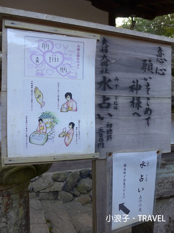 有興趣還可以到夫婦大國社參拜, 祈求締結良緣或夫婦和諧, 來個水占。